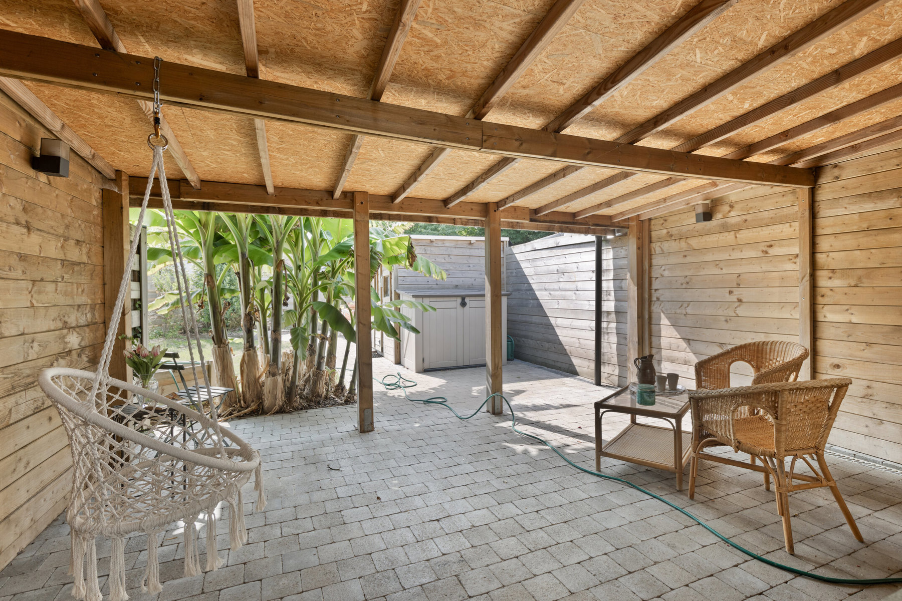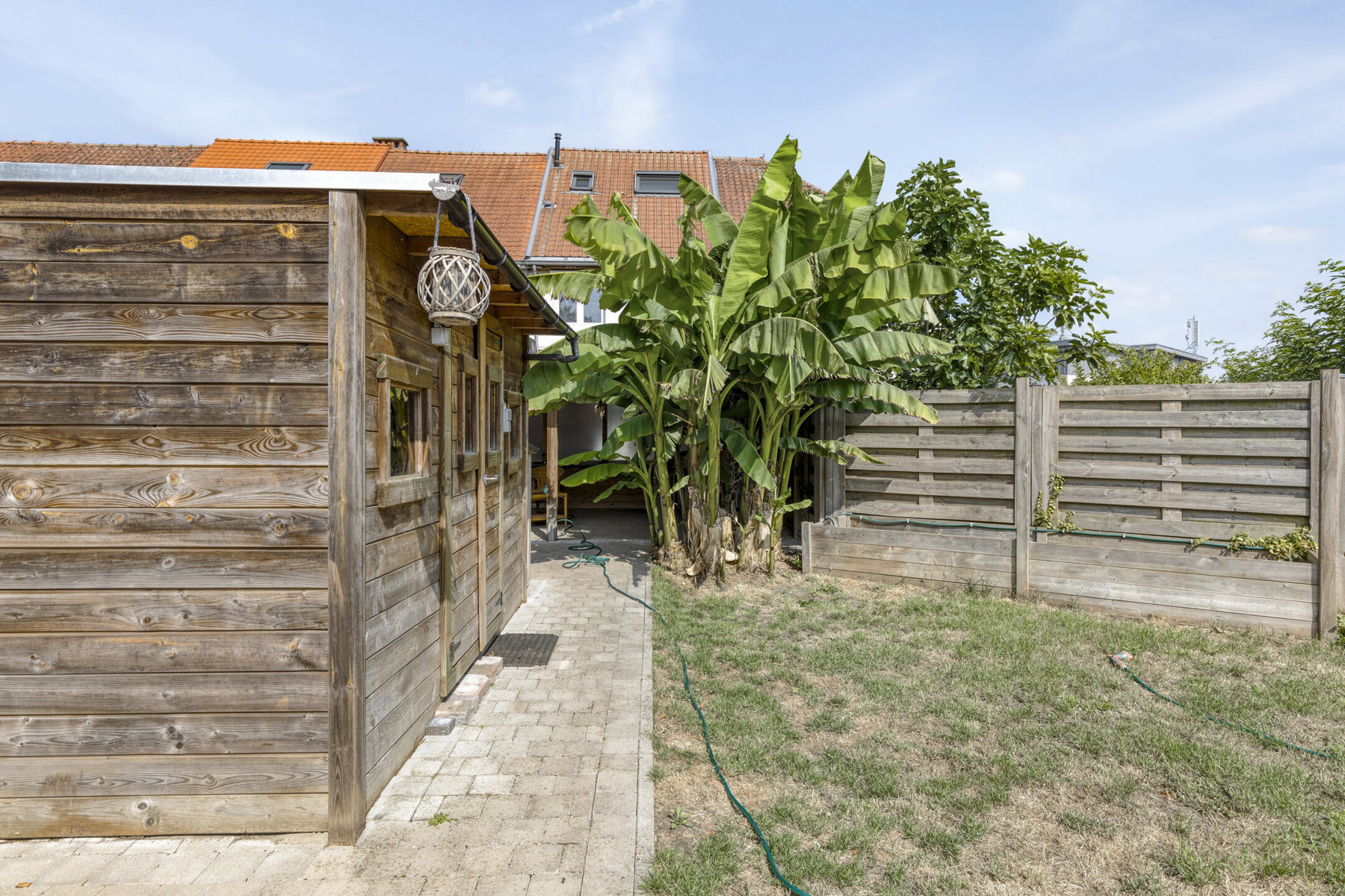 La cuisine entièrement équipée, attenante au séjour, est fonctionnelle et offre tous les appareils nécessaires ainsi que de nombreux rangements. Depuis la cuisine, vous accédez à une buanderie pratique, qui mène directement au jardin orienté plein sud. Ce bel espace extérieur est un véritable atout : vous y trouverez une terrasse couverte, une zone pavée parfaite pour vos activités en plein air, un grand a...