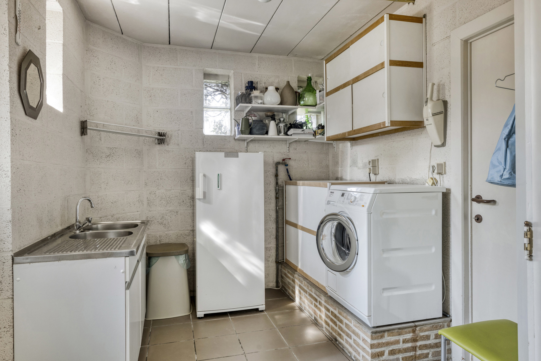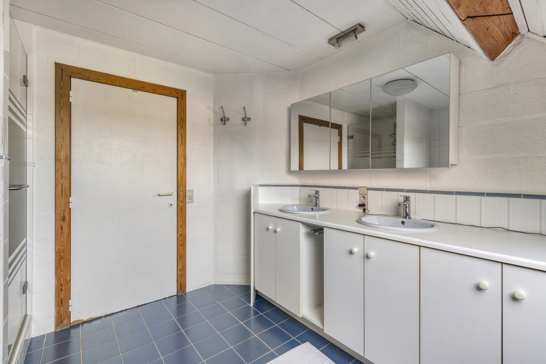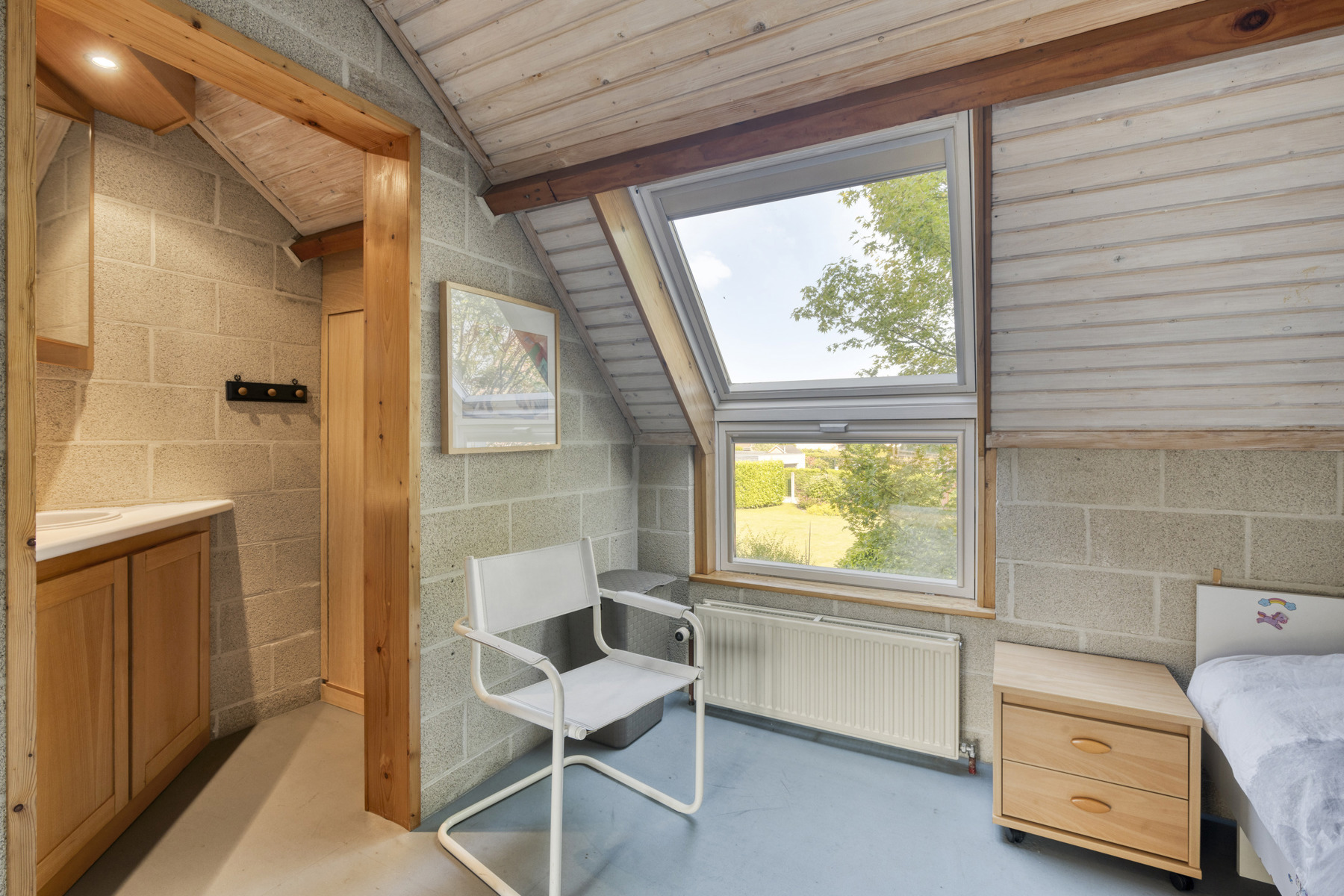 La maison dispose d’un hall d’entrée séparé pour la partie privée. Vous y découvrirez un vaste séjour lumineux avec de grandes baies vitrées offrant une vue imprenable sur le jardin orienté plein sud. Ce jardin, joliment aménagé, comprend un étang et plusieurs coins détente – un véritable havre de paix. La cuisine ouverte, entièrement équipée, est parfaitement agencée pour un confort optimal. Au rez-de-chaussée, vous trouverez également une grande buanderie ainsi qu’un double garage avec portes automatiques.