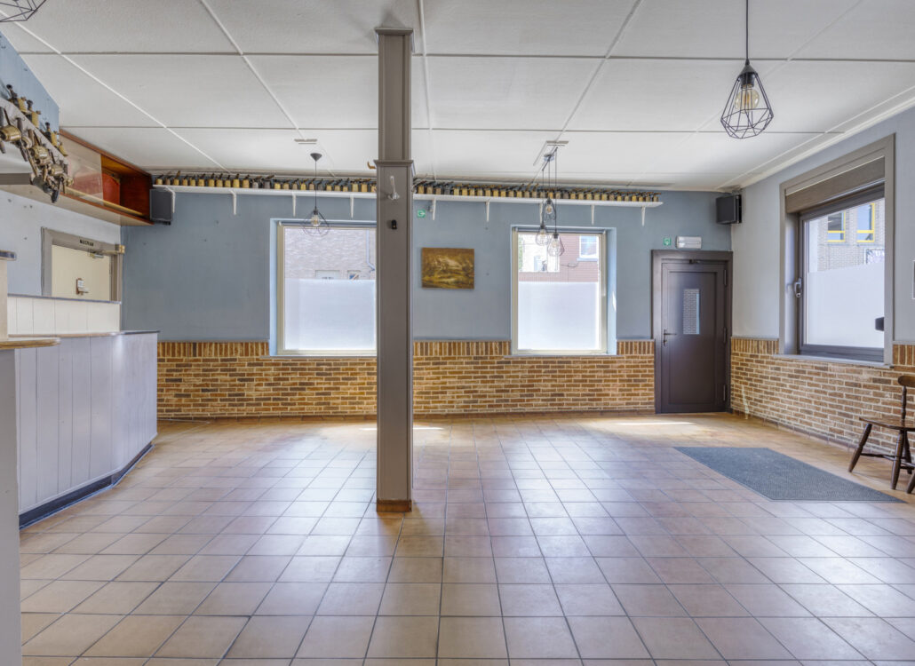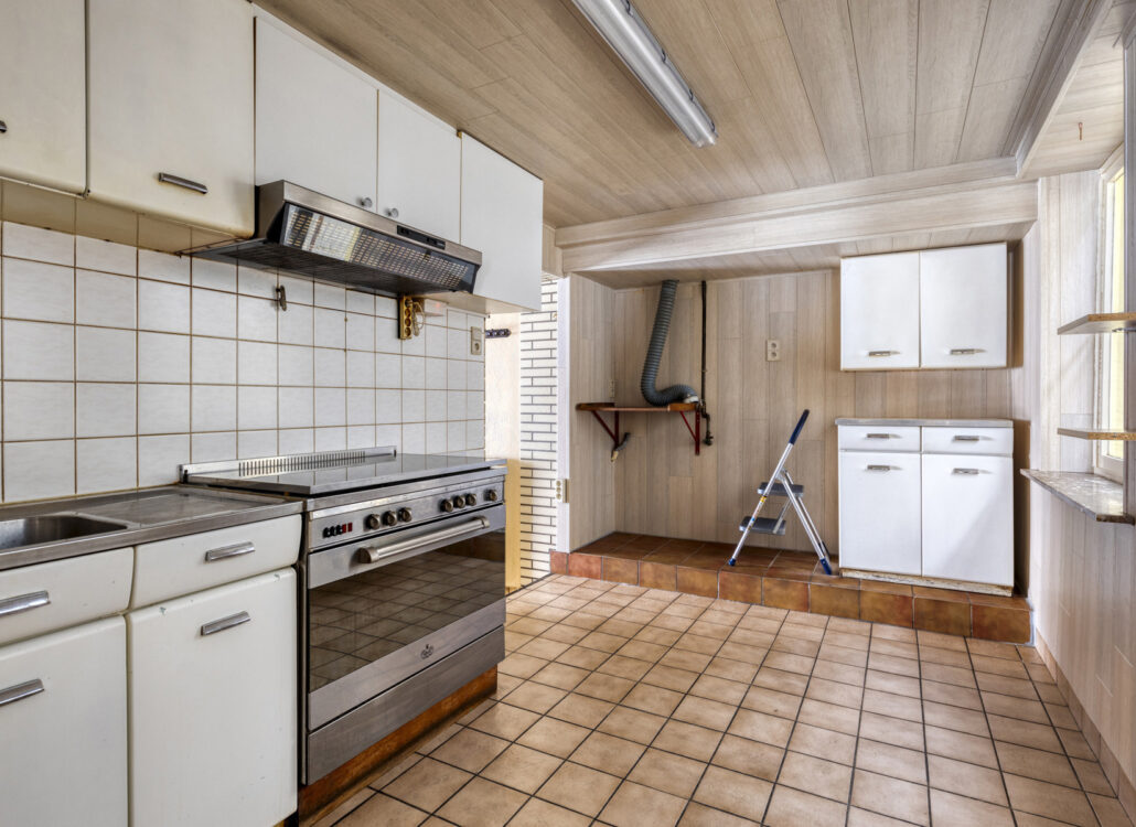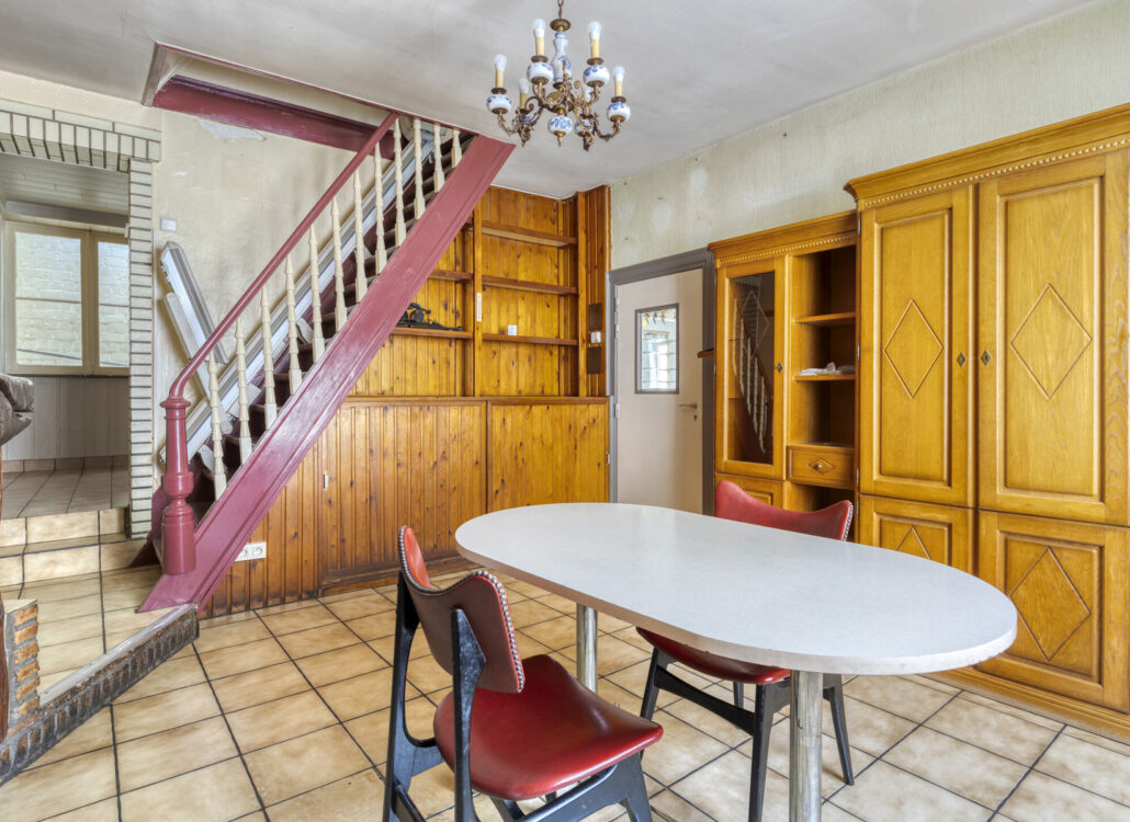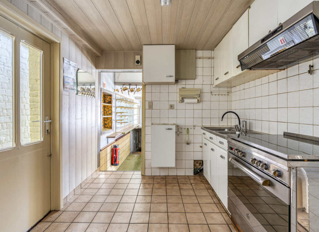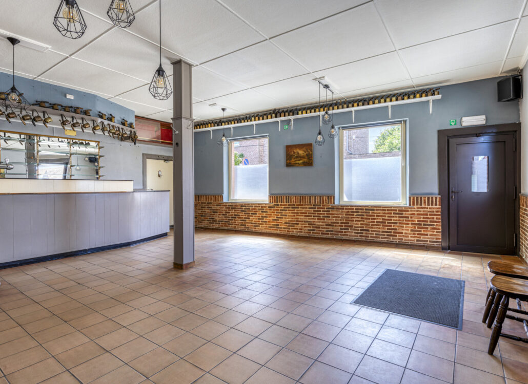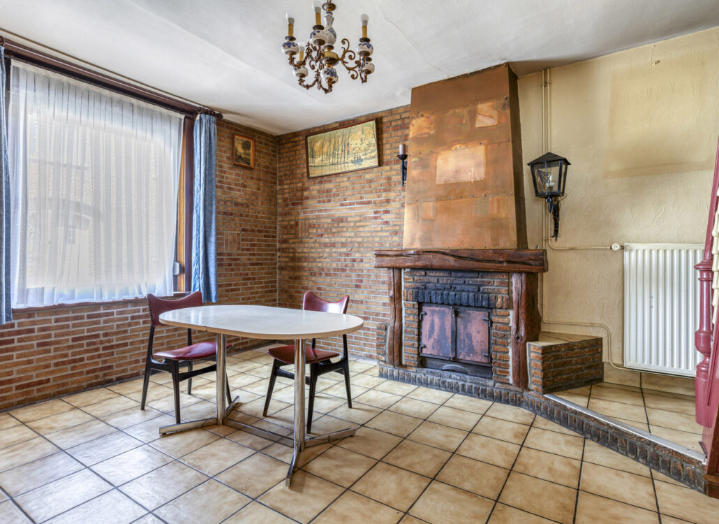 Bij het binnenkomen op het gelijkvloers valt meteen de ruime leefruimte op, die vroeger dienst deed als gelagzaal. De authentieke toog is nog aanwezig en vormt een unieke blikvanger — perfect voor wie houdt van een interieur met een verhaal. Aansluitend bevindt zich een praktische kelderkeuken en een aangename eetruimte met zicht op het achterliggende gedeelte van het huis.
