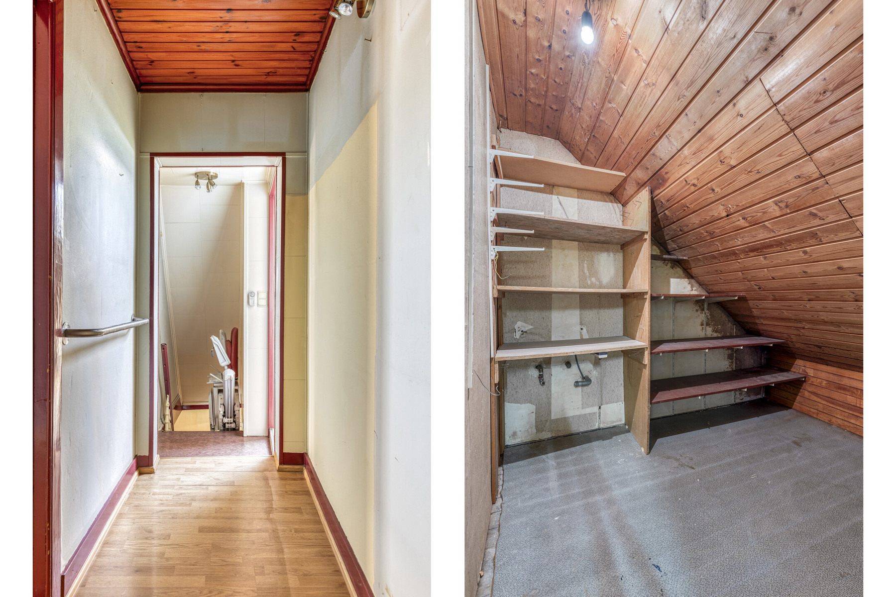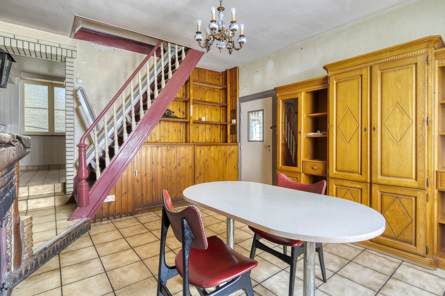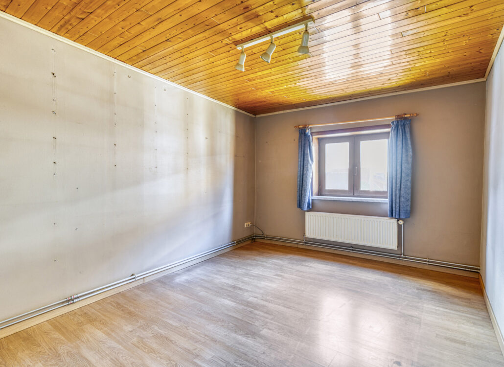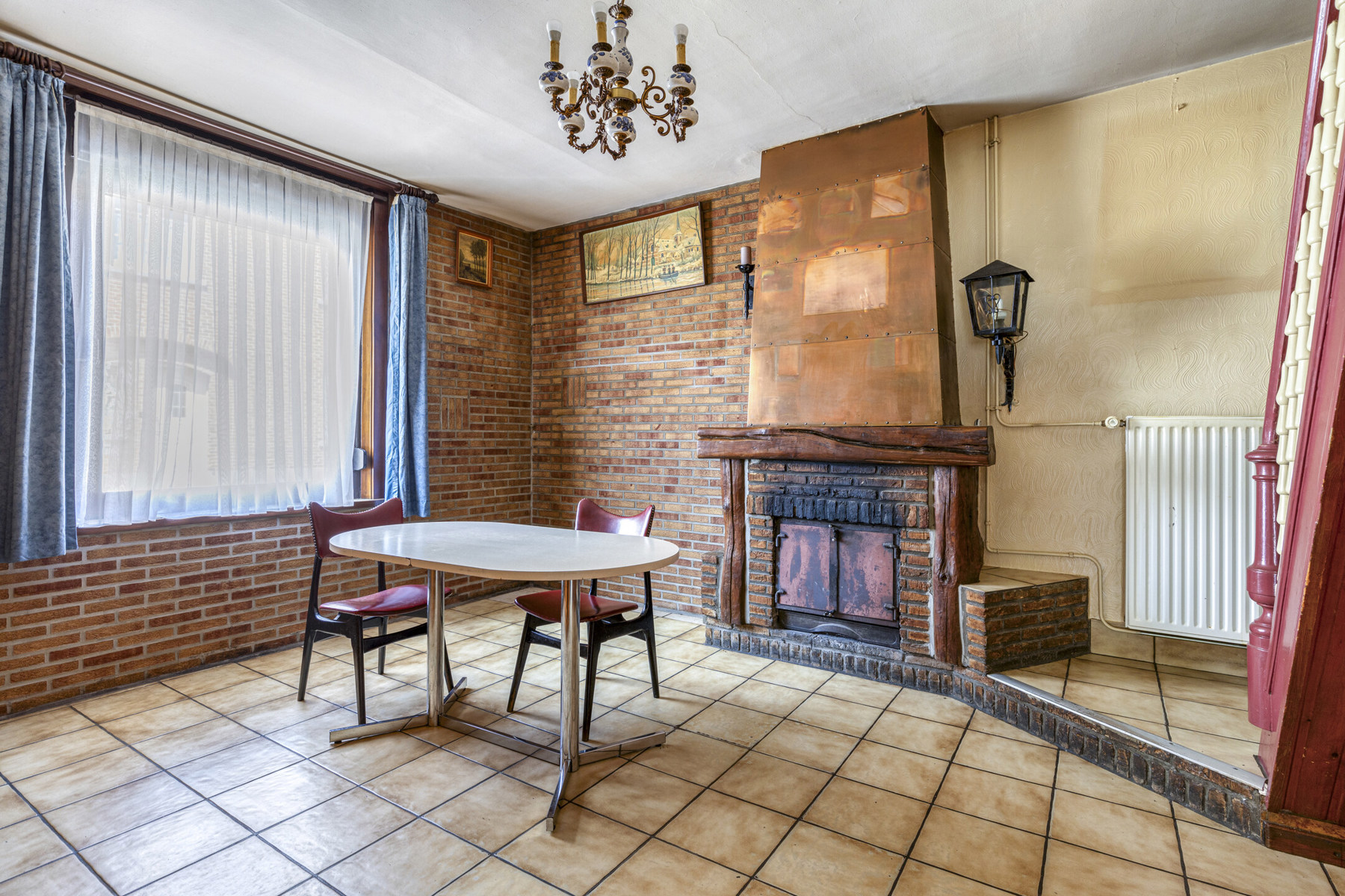 Bij het binnenkomen op het gelijkvloers valt meteen de ruime leefruimte op, die vroeger dienst deed als gelagzaal. De authentieke toog is nog aanwezig en vormt een unieke blikvanger — perfect voor wie houdt van een interieur met een verhaal. Aansluitend bevindt zich een praktische kelderkeuken en een aangename eetruimte met zicht op het achterliggende gedeelte van het huis.